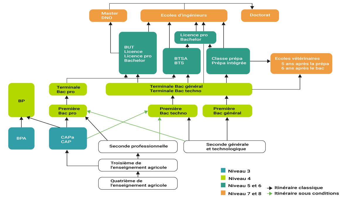 Pour plus de lisibilité, ce schéma est simplifié. Toutes les passerelles existantes entre les différents diplômes ne sont pas représentées.